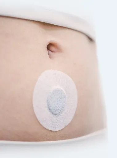 Chip jest wklejony w okrągły plaster, który nie podrażnia skóry i przepuszcza powietrze.